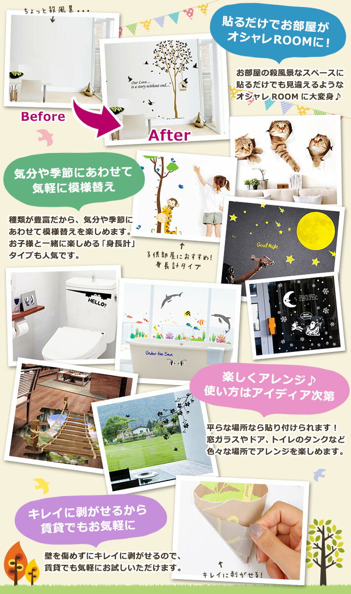 お手頃価格なので、プレゼントにもオススメです! 仕上がり図を参考に貼るだけ簡単なシールタイプのウォールステッカーは一人でもお子様と一緒にでも楽しくデコレーションできるのでオススメです。
